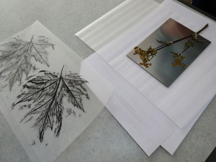 Participants spent the first day preparing their plates by selecting suitable artwork/foliage and exposing plates to daylight. The plates were then developed in tap water and post exposed. The following day participants were shown how to ink up and print their plates, using both intaglio and relief printing techniques and a small etching press.